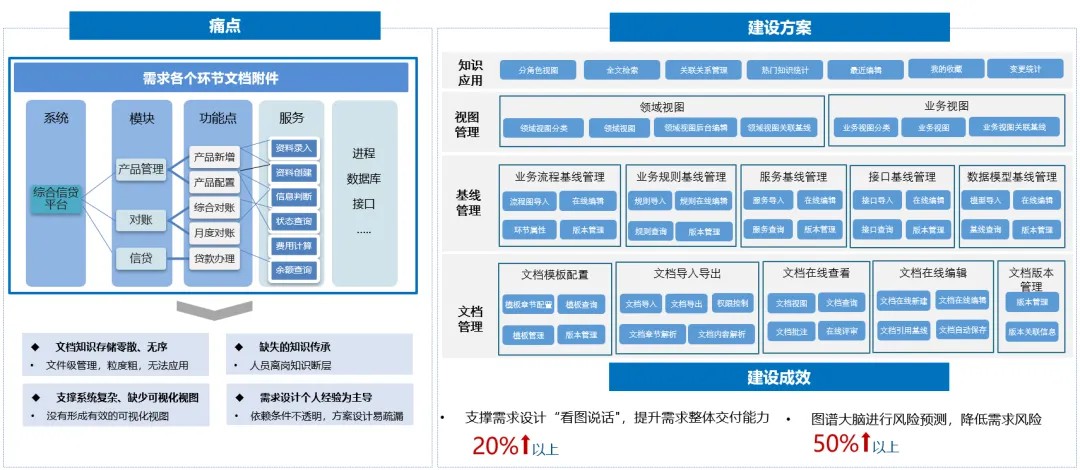 建设方案:将散乱的、与需求开发过程相关的各类知识进行集中化、透明化管理,指导需求设计和开发,提高方案设计效率和需求交付效能。